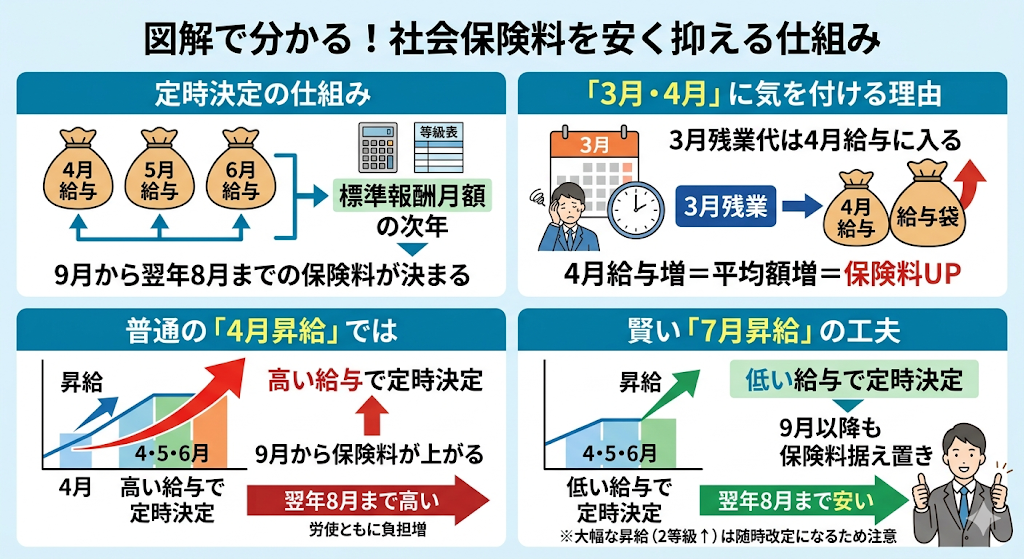 4.【右下】かしこい工夫:「7月昇給」にすると保険料が据え置きに!